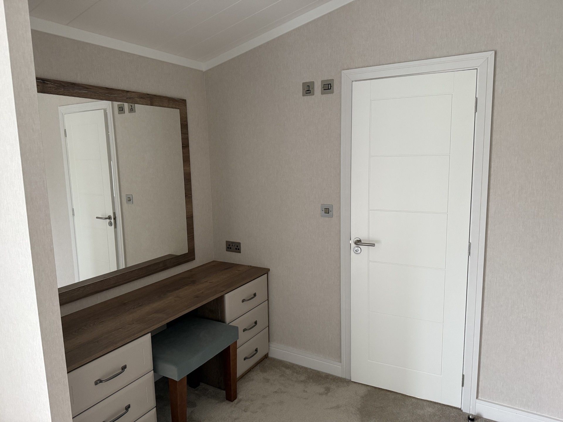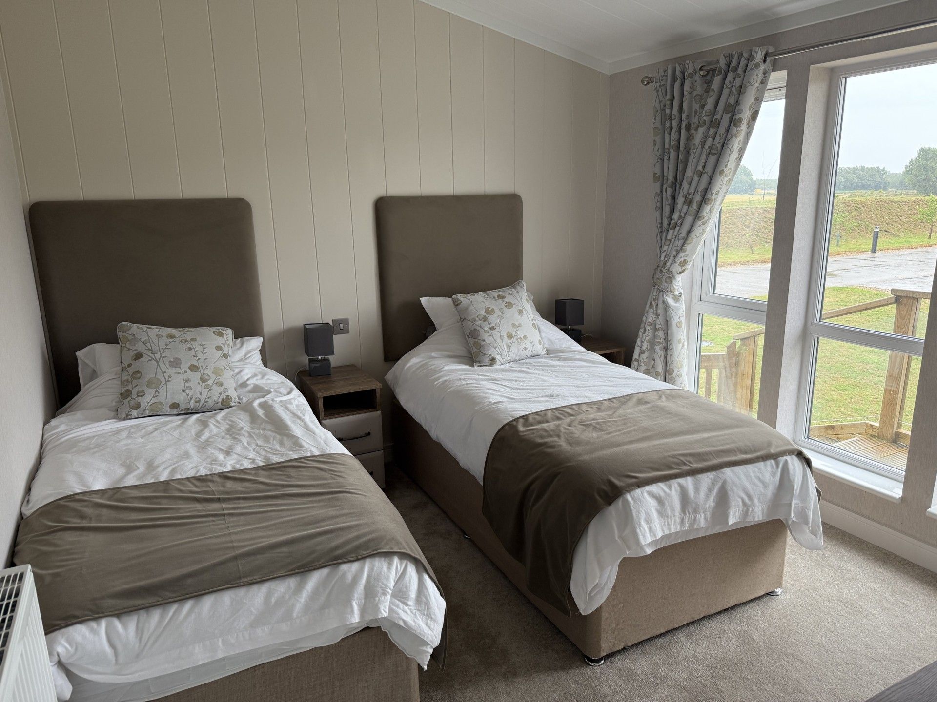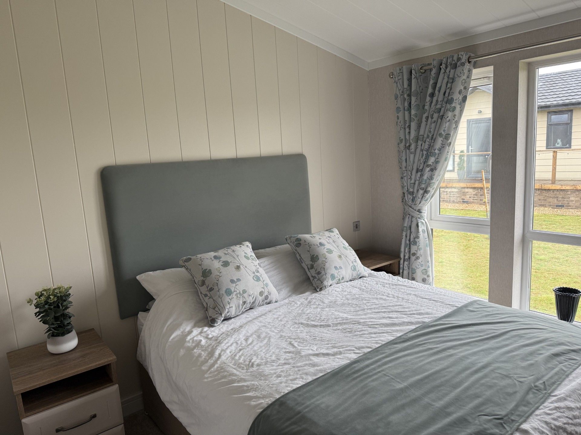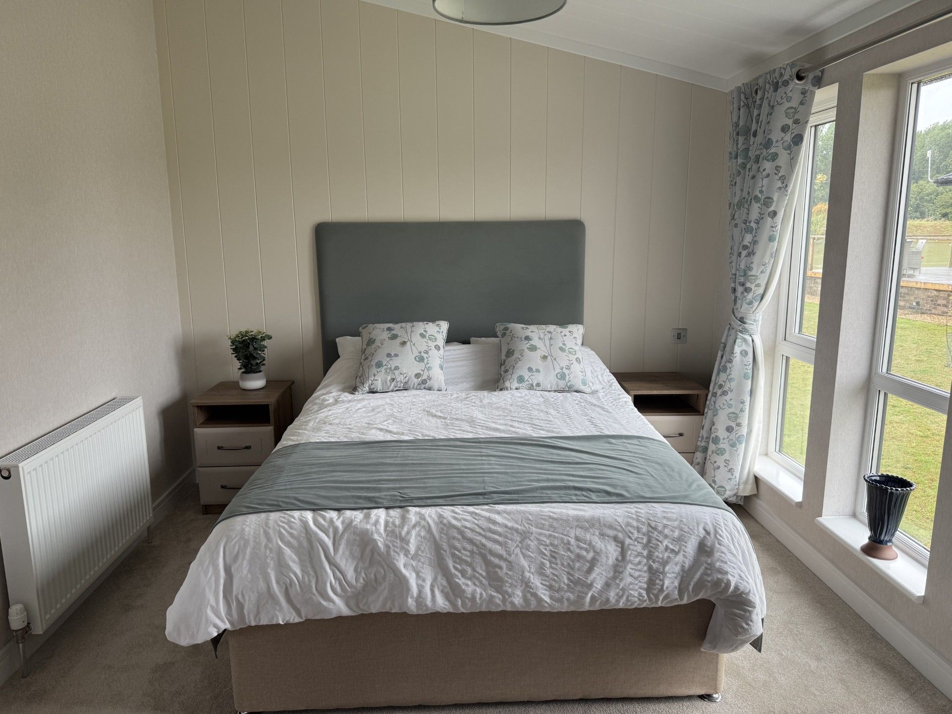 Bulit in May 2022, this Omar Kingfisher sits near the end of the quiet and secluded Waterfall Way, the newest extension to Heron Lakes. Its south facing extended decking incorporates a built-in hot tub and provides the potential for 12 hours of sunshine. The outside garden space is untouched providing the option to landscape, and there is private parking for up to 3 cars, and a small shed. Site fees are paid until April 2026.