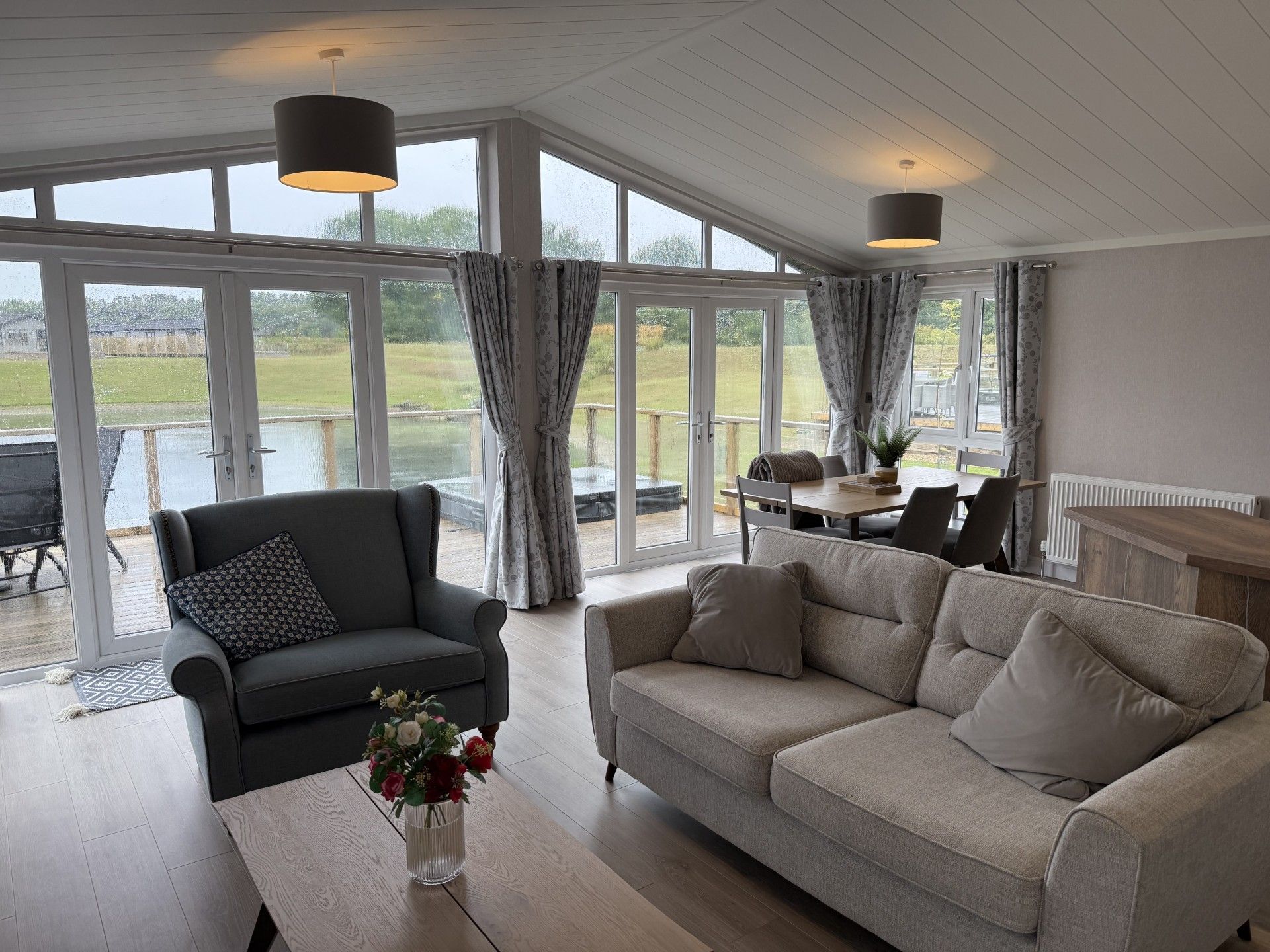The open plan living space which enjoys panoramic views of the lake, can be accessed by 2 sets of French Doors. All external windows and doors have 2 years remaining of the manufacturer's guarantee. Included are a dining table and 6 chairs, 3 sofas of which one turns into a double sofa bed; a TV is also included. Fitted appliances throughout the kitchen including double oven, with microwave included.