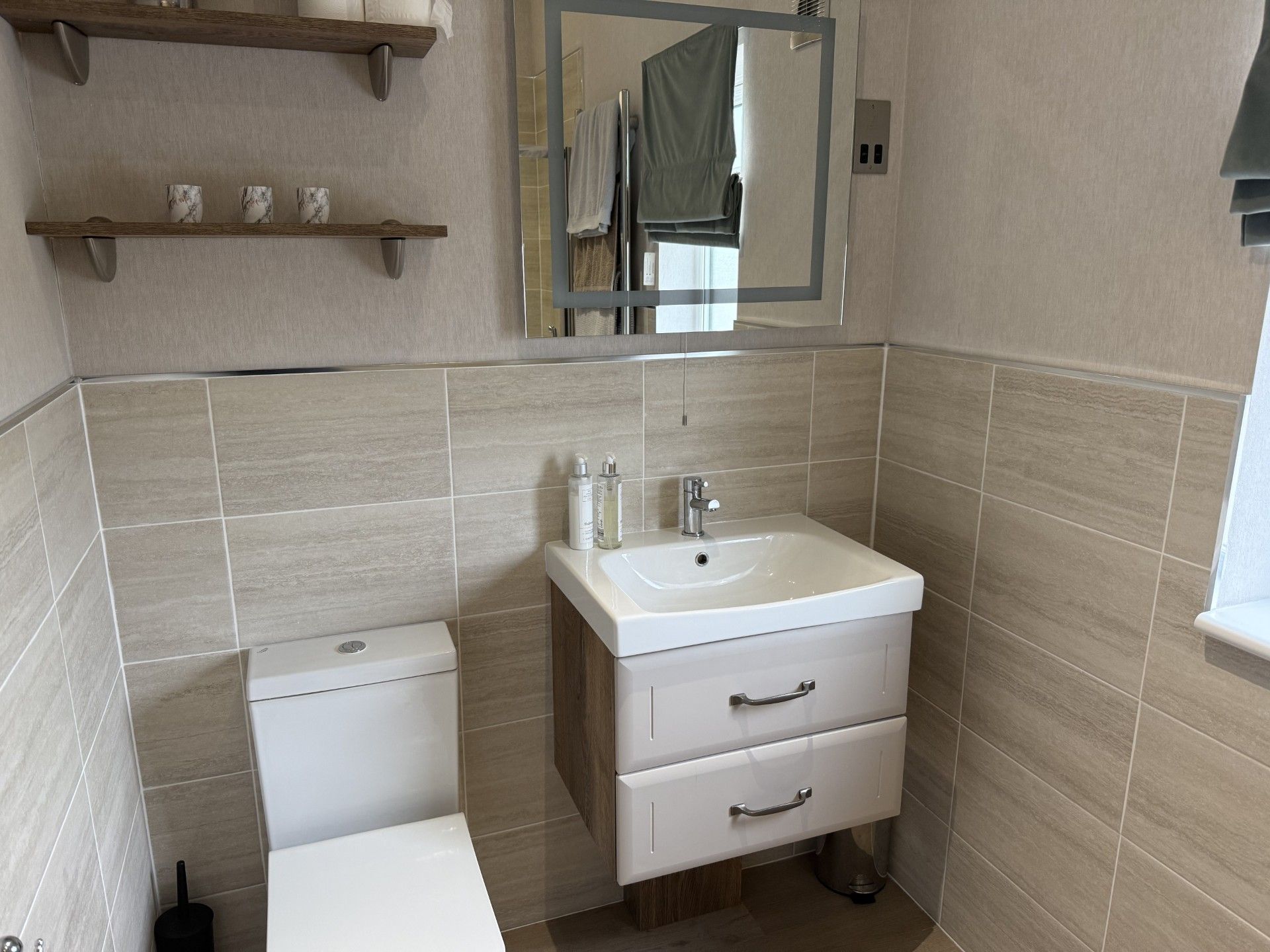 The main double bedroom incorporates an extended dressing area and ensuite bathroom, with shower. The second bedroom has twin beds but is large enough for a double bed, and all beds and mattresses are included. Both bedrooms enjoy fitted storage. The main bathroom has a shower that fits over the bath.