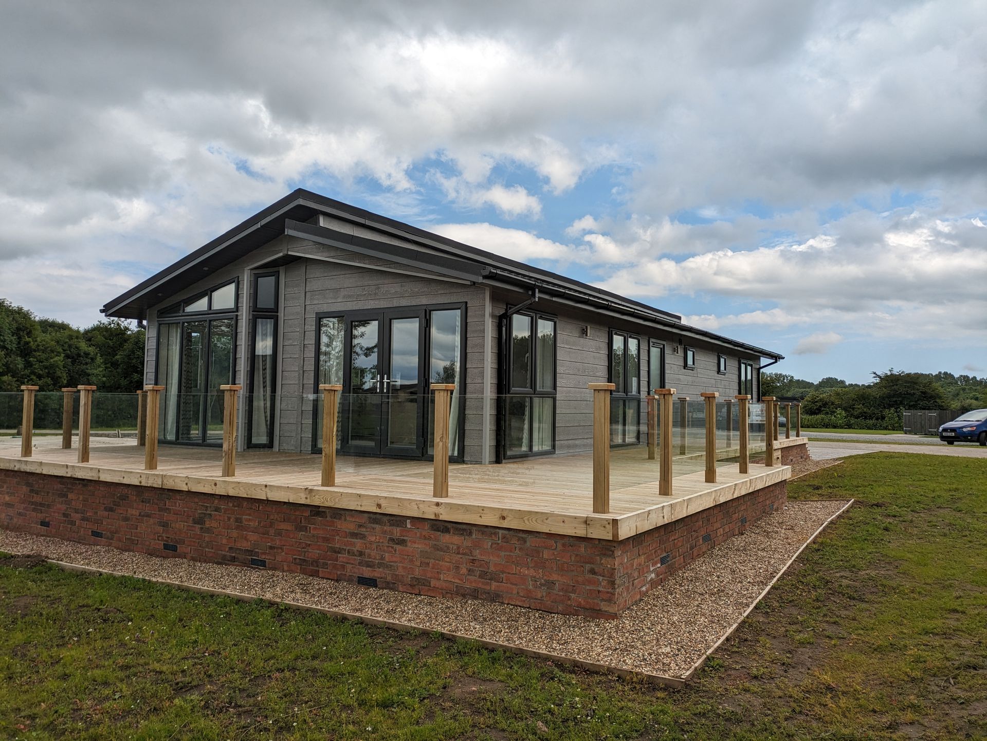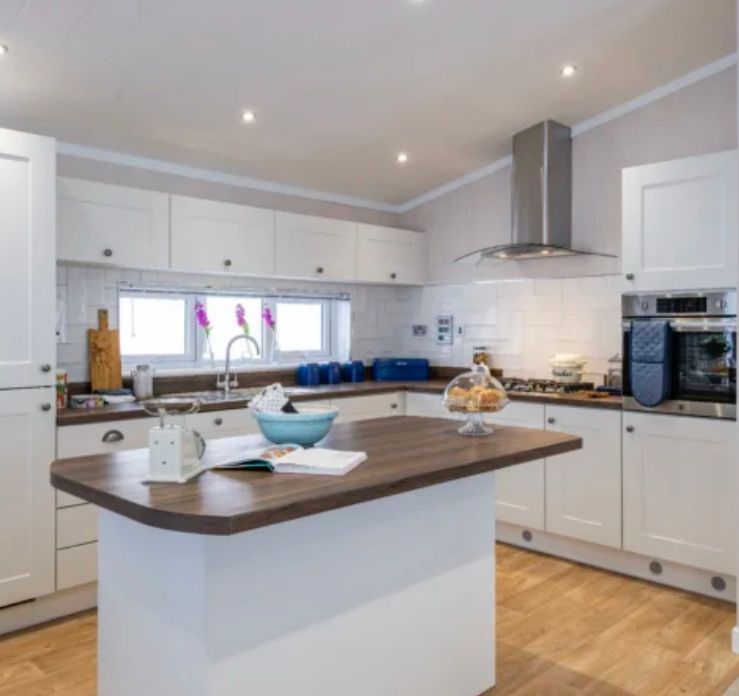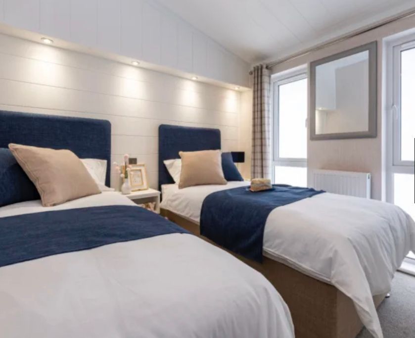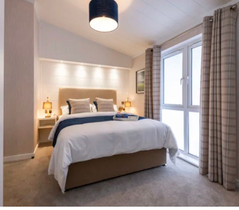 The 3 bed Alderney is situated on the Trout Lake and the exterior has a split roofline with a canexcel cladding.This lodge is open plan with large picture windows throughout. It has lots of modern features including a paneled vaulted ceilings and down lights in most rooms. The bedrooms have plenty of storage and floating bedside shelves, giving it a contempary edge. There is a large ensuite bedroom and a well presented family bathroom.