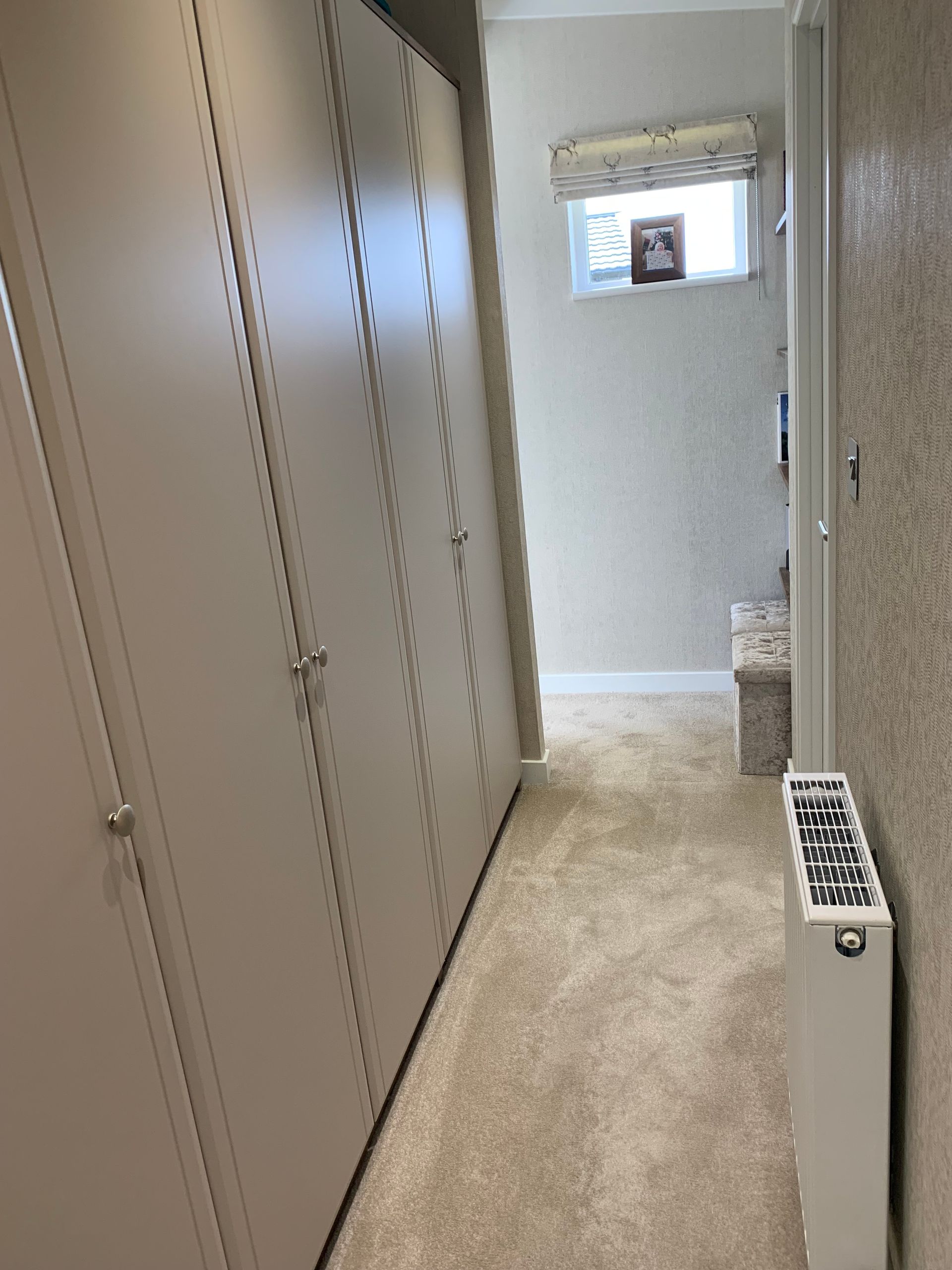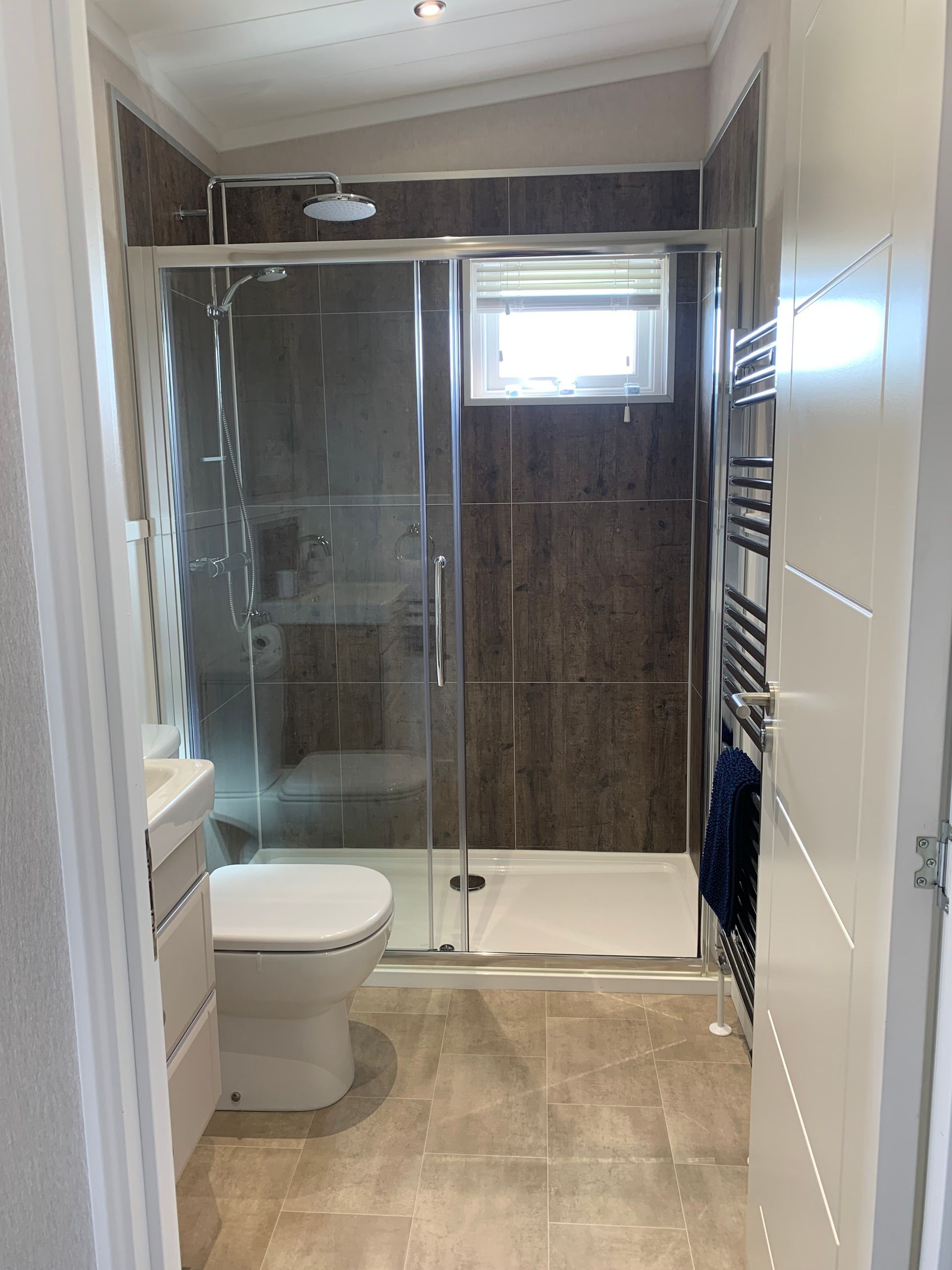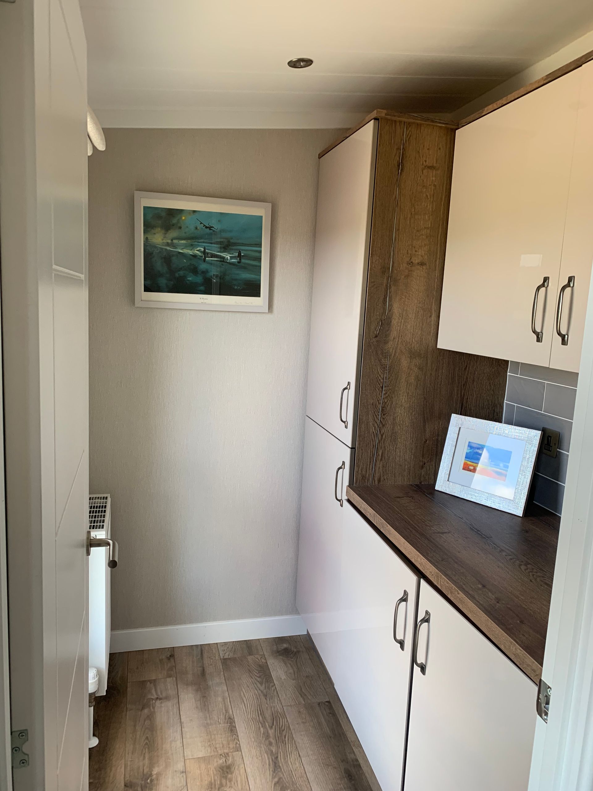 Entrance to Lodge has a wide entrance with seating and storage, leading to Utility room with Integral Washing machine and Integral Dryer. Storage space and LPG gas boiler.