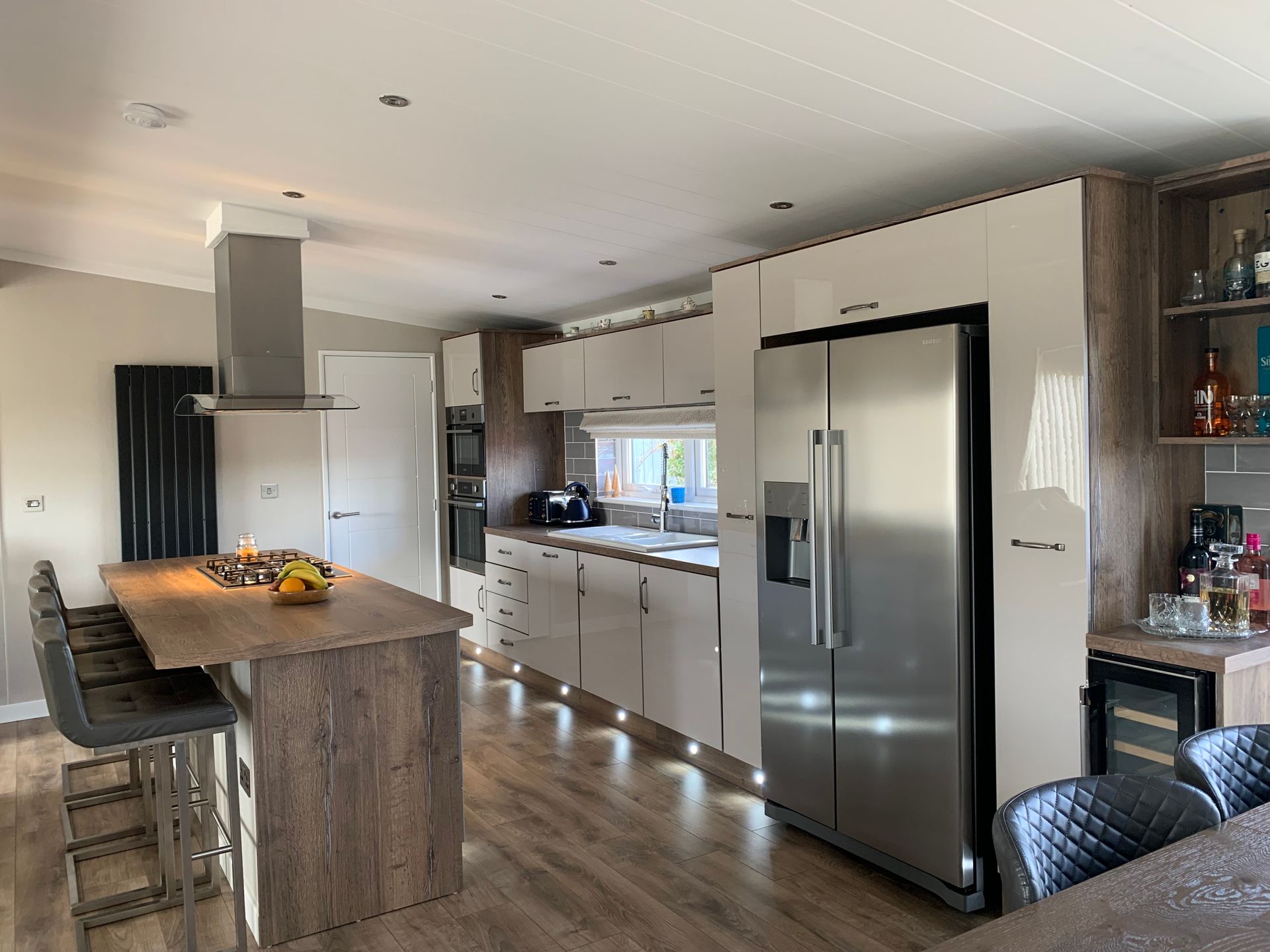 Kitchen boasts an American fridge freezer and separate wine fridge. Integrated dishwasher, eye level oven and separate combi microwave oven. 5 ring gas hob with extractor over central island with barstools for 4 people. Separate utility storage cupboard.